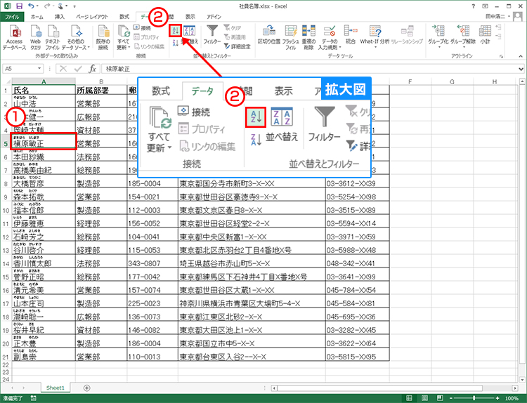 まずは「並べ替え」の機能から見ていきましょう。並べ替えが必要になる例としては、住所録で氏名の50音順に並べ替えたい場合などです。もちろん作成時に50音順で入力してもOKですが、大量のデータの入力がある場合はそういうわけにもいきません。その点、並べ替えの機能を使えば、後から自在に順番を整えられるので非常に便利です。今回は会社の社員名簿という設定で並べ替えを使用します。