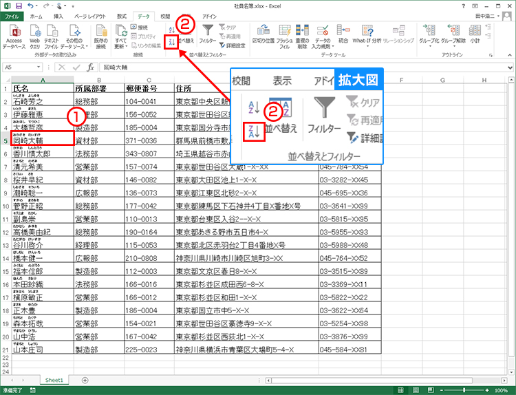 いずれかの氏名を選択した状態で、[データ]タブの[並べ替えとフィルター]にある「昇順」をクリックします。