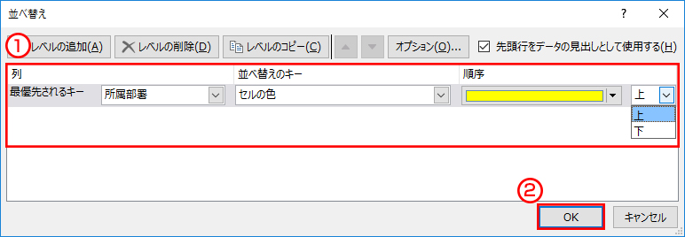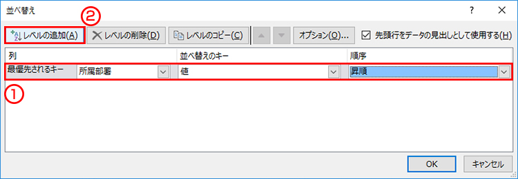[並べ替え]ダイアログボックスが表示されます。ここで[再優先されるキー]を「所属部署」、[並べ替えのキー]は「値」、[順序]は「昇順」に設定します。続いて、2番目の条件を指定するために、[レベルの追加]をクリックします。