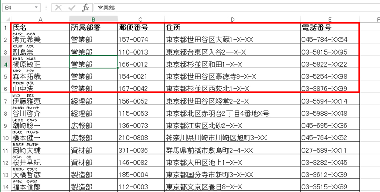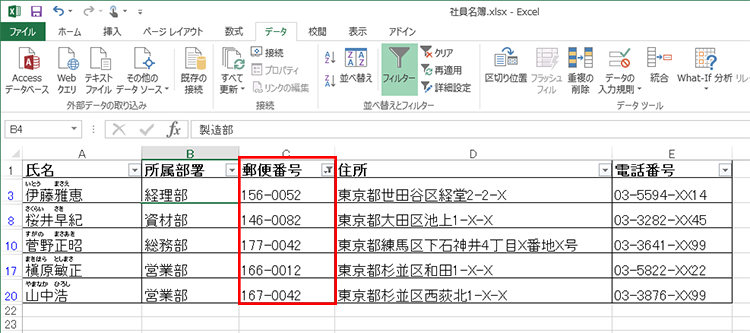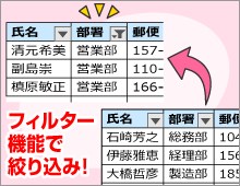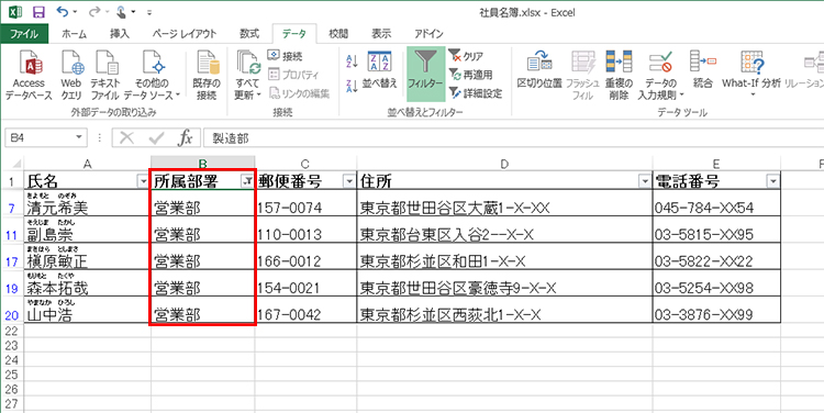 このように、営業部に所属する人のデータだけが表示されるようになりました。この手順で各種条件を指定して、必要なデータを簡単に表示できます。なお、フィルターで絞り込んでいるときは、「▼」ボタンがフィルターの形に変化します。