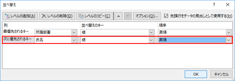 [次に優先されるキー]の設定欄が表示されるので、2番目の条件を指定していきます。ここでは、優先されるキーを「氏名」、[並べ替えのキー]は「値」、[順序]は「昇順」に設定します。すべての条件を設定したら、「OK」をクリックします。