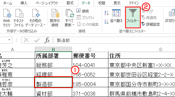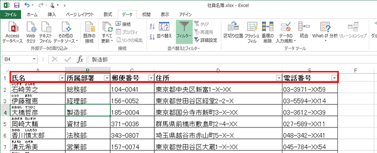 「氏名」「所属部署」などの見出し行は、太字やセルに色を付けるなどして書式を変更しておきます。表内のセルを選択した状態で、[データ]タブの[フィルター]ボタンをクリックします。