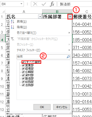 「所属部署」の右横にあるフィルターボタンをクリックし、[すべて選択]のチェックボックスをクリックします。