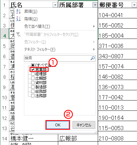 いったんすべてのチェックボックスがオフになります。抽出したい「営業部」のチェックボックスをクリックしてチェックを付け、[OK]ボタンをクリックします。