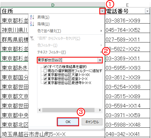 「住所」の右横にあるフィルターボタンをクリックし、[検索]欄に「東京都世田谷区」と入力します。入力した文字列を含む項目だけにチェックが入るので、[OK]ボタンをクリックします。