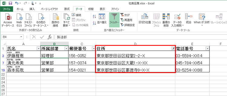 このように「住所」欄に「東京都世田谷区」を含む行だけが表示されました。