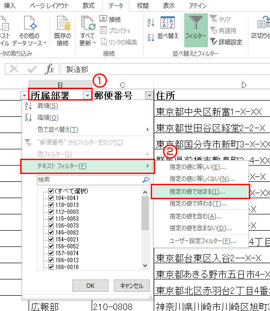 例えば、郵便番号が「1」で始まり、なおかつ末尾が「2」で終わるデータを抽出したいときは、「郵便番号」の横にある[▼]をクリックし、[テキストフィルター]から[指定の値で始まる]を選択します。