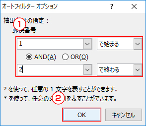 オートフィルターオプションが表示されるので、この例では上段に「1」を入力し、[AND]を選択。さらに下段に「2」と入力し、右端のプルダウンボタンから[で終わる]を選択して[OK]をクリックします。