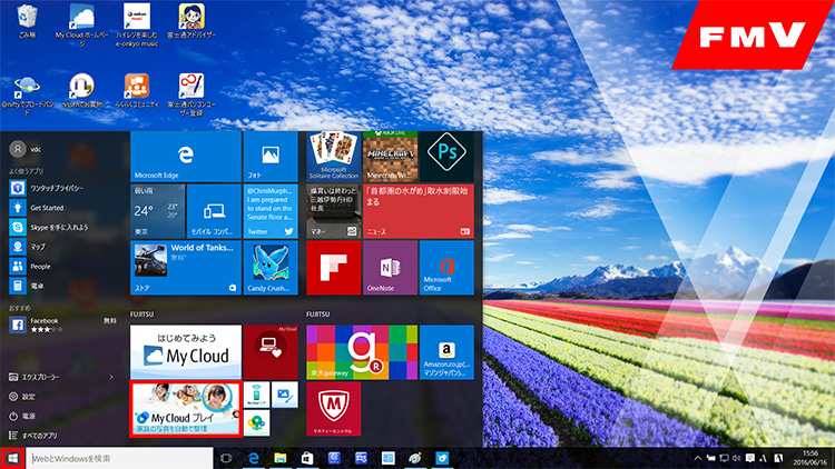 デスクトップ画面左下の「Windows」ボタンをクリックしてスタート画面を表示し、タイルメニューから、「My Cloud プレイ」を選びます。タイルメニューに見当たらない場合、「すべてのアプリ」から「My Cloud プレイ」を選びます。
