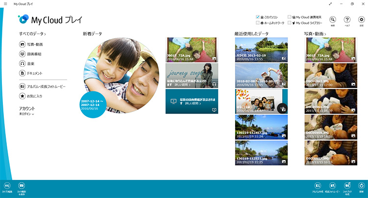 画像や動画をCドライブのピクチャフォルダに取り込み終わったら、「My Cloud プレイ」を起動して、使う準備をしましょう。最初だけ、確認画面が表示されます。また、「My Cloud アカウント」を登録しておくと、すべての機能が利用できるようになります。