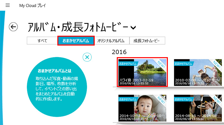 「おまかせアルバム」は、パソコンが自動で作成してくれるアルバムです。取り込んだデータの撮影日付や枚数、撮影場所などの情報が自動で分析されて、作られます。写真は自動でレイアウトされ、アルバムのページをめくるように見ることができます。