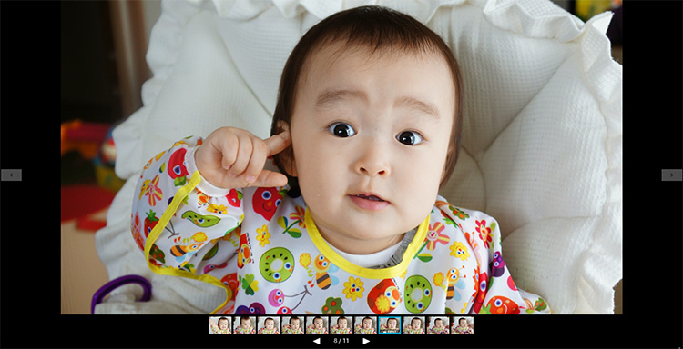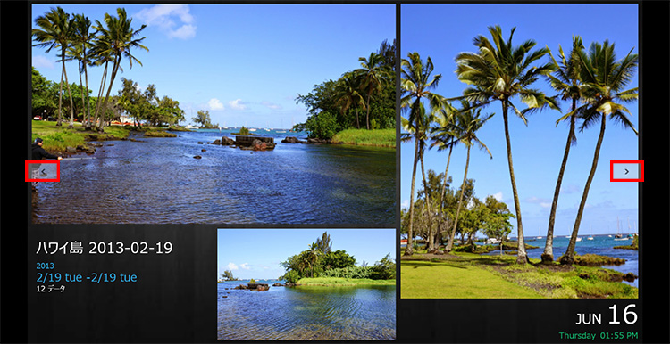左右に表示される[<][>]をクリックすると、アルバムのページをめくるように、写真を見ることができます。