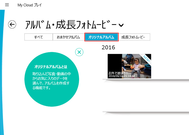 ホーム画面で「アルバム・成長フォトムービー」をクリックし、「アルバム・成長フォトムービー」の画面で「オリジナルアルバム」をクリックすると、アルバムの一覧に追加されています。