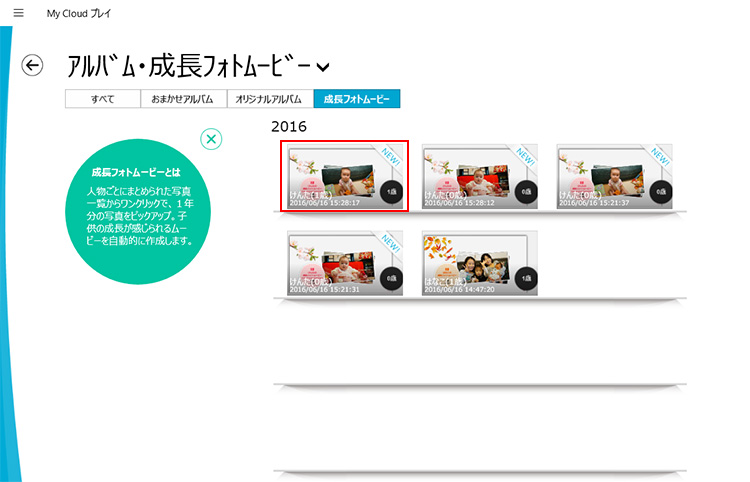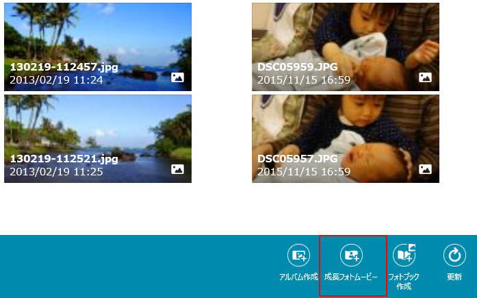 ホーム画面で「アルバム・成長フォトムービー」をクリックし、「アルバム・成長フォトムービー」の画面で「成長フォトムービー」をクリックすると、アルバムの一覧に追加されています。