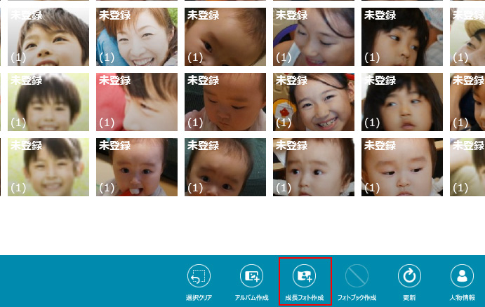 人物ごとにまとめられた写真の一覧から、一年ごとの思い出ムービーを作成できます。子どもの成長を確認したり、友達との楽しい一年を振り返ったりしてみましょう。「成長フォトムービー」は、選択した人物の写真をパソコンが自動でピックアップし、一年間分を季節ごとにまとめてレイアウトし、BGM付きのフォトムービーにしてくれる機能です。なお、実行する前には人物情報の登録が必要です。下のコラムもご参照ください。