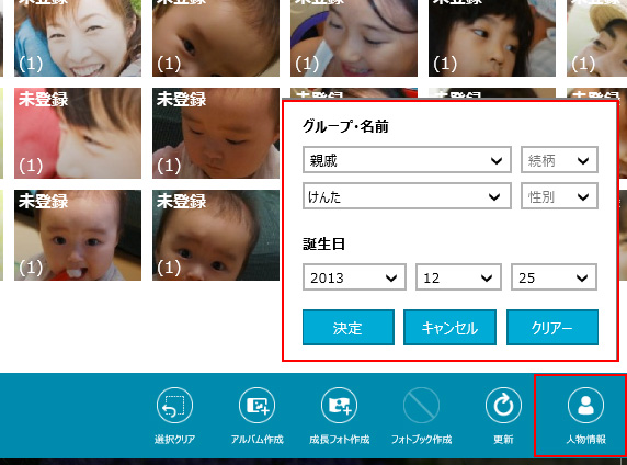 成長フォトムービーを作成するには、名前や誕生日を正しく登録しておくことが必要です。「人物情報」の登録内容を確認し、必要に応じて変更しましょう。