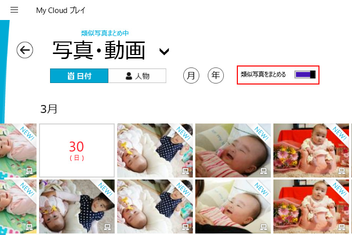 写真、動画の一覧画面を表示します。「類似写真をまとめる」のスイッチを有効にします。