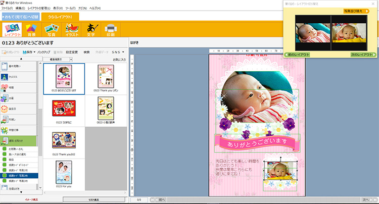 筆ぐるめが起動し、はがきの種類を選ぶだけで、自動で写真がレイアウトされます。必要に応じてメッセージを変更するなどしましょう。