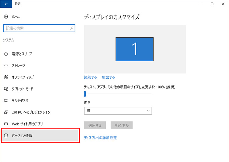 「スタート」ボタンをクリックして、「設定」→「システム」を開いて「バージョン情報」をクリックします。