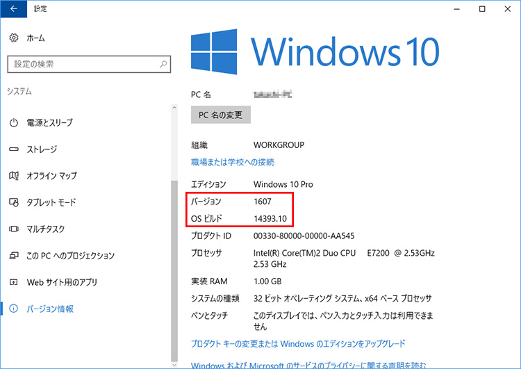 このアップデートが適用されたパソコンは、Windows 10のバージョン番号が「1607」に変更されています。まずはお使いのパソコンのシステム情報を開いて、すでにアップデートが適用されているかどうか確認しましょう。