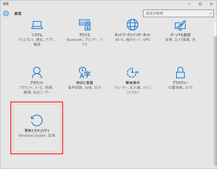 「スタート」→「設定」を開いて、「更新とセキュリティ」をクリックします。