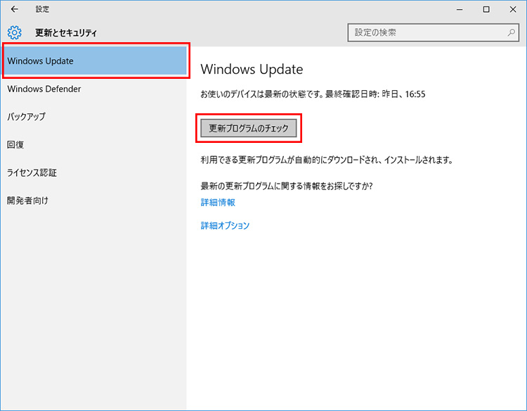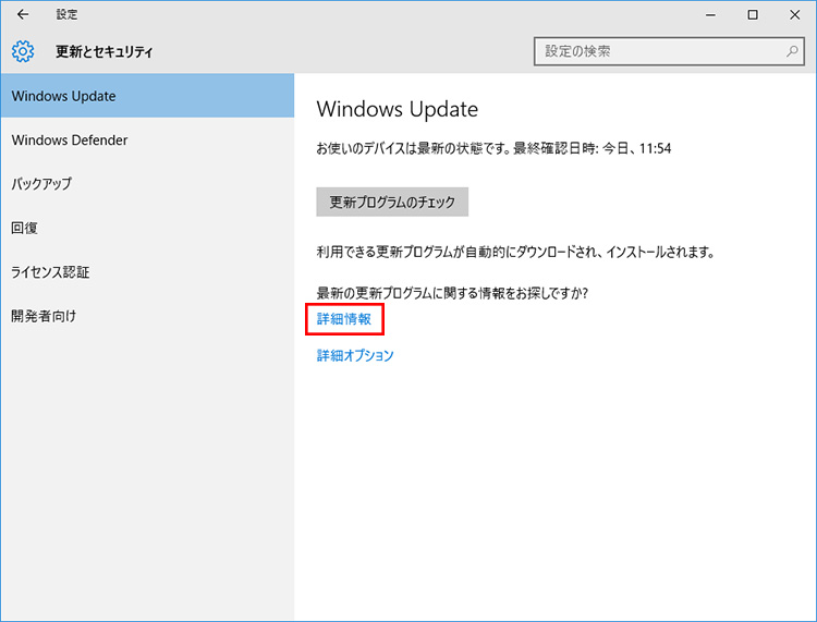 「設定」→「更新とセキュリティ」→「Windows Update」を開いて、「詳細情報」をクリックします。