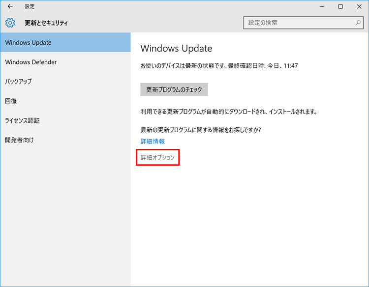 「Windows Update」の画面下部にある「詳細オプション」をクリックします。