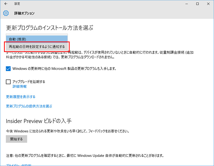 「更新プログラムのインストール方法を選ぶ」のプルダウンメニューをクリックし、「再起動の日時を設定するように通知する」に変更すればOKです。