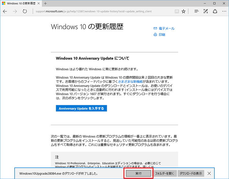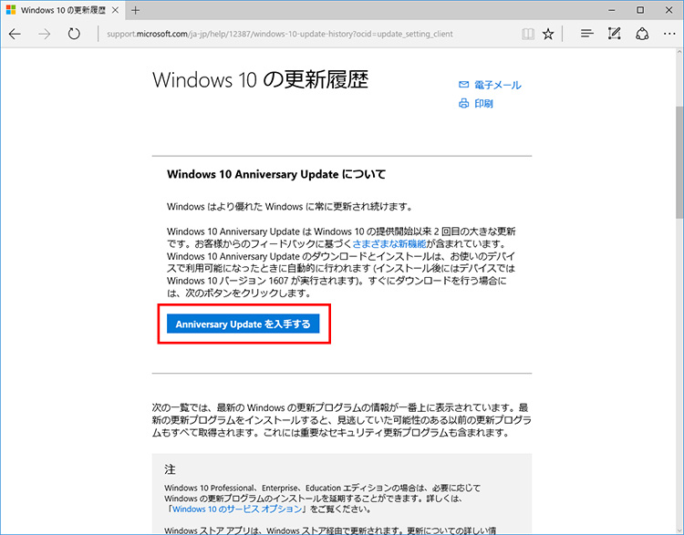 ブラウザーが起動して、「Windowsの更新履歴」というページが表示されます。このページ内にある「Anniversary Updateを入手する」をクリックします。