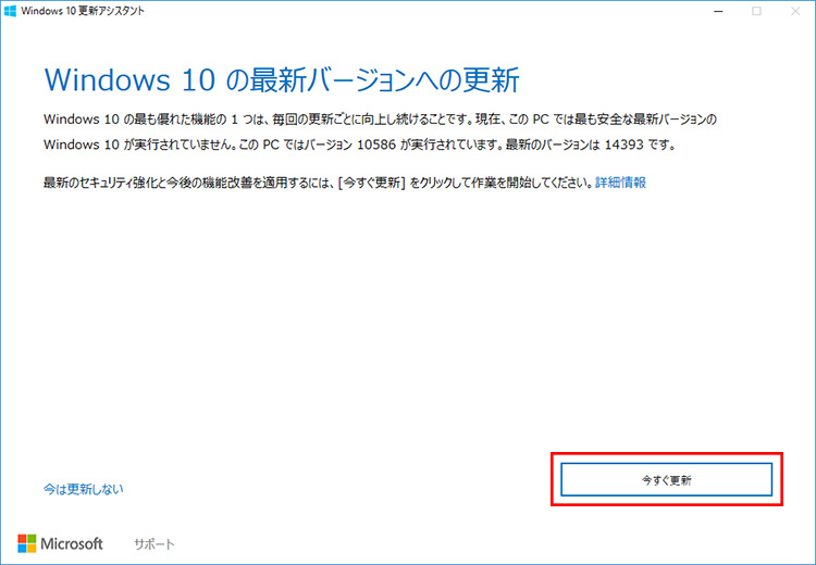 Windows 10更新アシスタントが表示されるので、「今すぐ更新」をクリックすればAnniversary Updateの更新が開始されるしくみです。