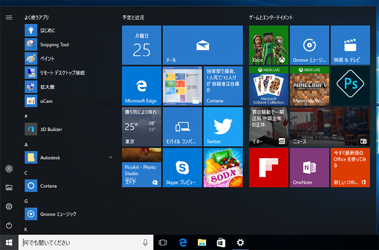 スタート画面を開くと、左サイドにユーザーアイコン、電源や設定などのボタンが小さくまとめられています。右側にすべてのアプリが表示されているので、以前よりもスムーズにアプリを開けます。