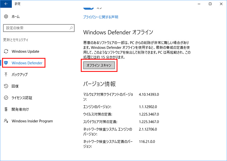 オフラインスキャンを実行したい場合は、「スタート」→「設定」→「更新とセキュリティ」をクリックします。左側のメニューから「Windows Defender」を開き、画面右側で「オフライン スキャン」をクリックします。