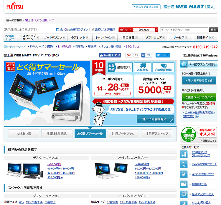 Windows 10搭載のパソコンを購入するなら「富士通 WEB MART」がお得