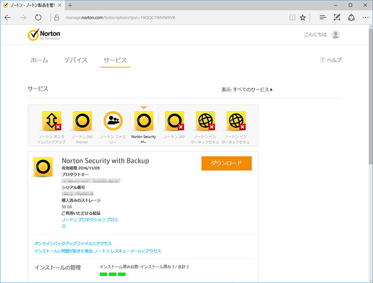 Webサイト上で確認できる場合もあります。画面はセキュリティソフトのノートン製品のユーザー専用ページです。
