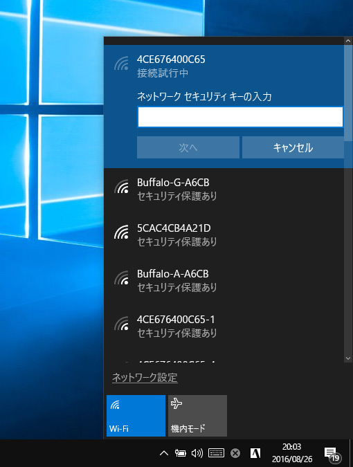 通知領域でネットワークのアイコンをクリックすると、利用できるWi-FiルーターのSSIDが表示されます。接続する際には、セキュリティキーの入力を求められます。