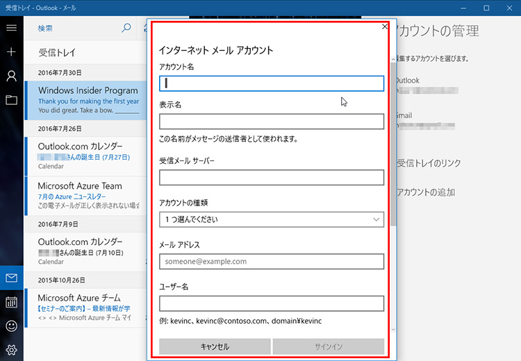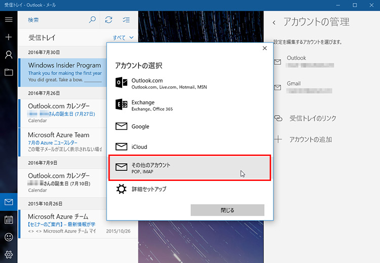 Windows 10付属のメールアプリです。プロバイダーのメールを利用するには、[その他のアカウント]または[詳細セットアップ]をクリックして、必要な情報を入力する必要があります。