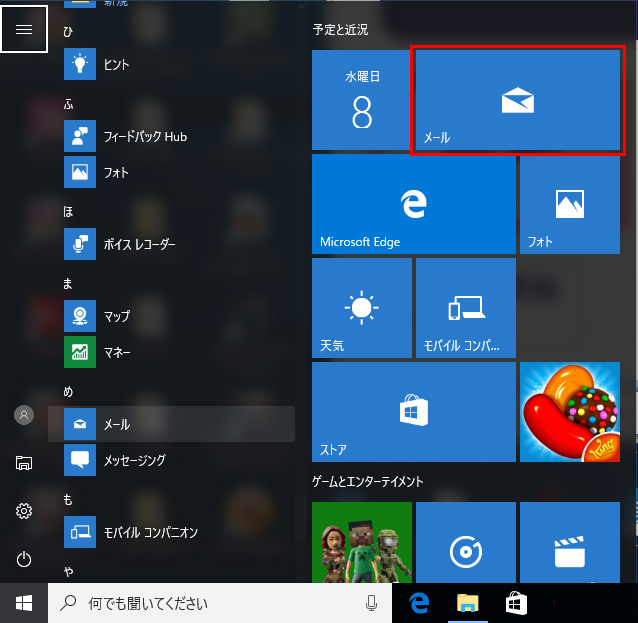 スタートボタンをクリックし、アプリの一覧やタイル画面の「メール」をクリックします。初めて起動したときにはメッセージが表示されるので、「使ってみる」→「開始」の順にクリックします。使用できるアカウントがない場合、この後の画面「アカウント追加」より、アカウントを追加してください。