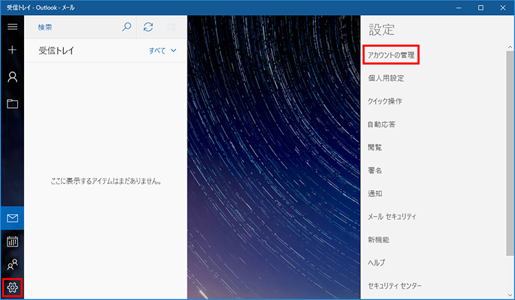 アプリが起動したら、画面左の「設定」アイコンをクリックします。「設定」メニューが表示されたら、「アカウントの管理」をクリックします。