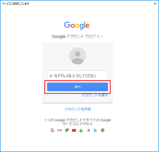 Googleアカウントのメールアドレスを入力して、「次へ」をクリックします。この後、パスワードを入力して「次へ」をクリックします。