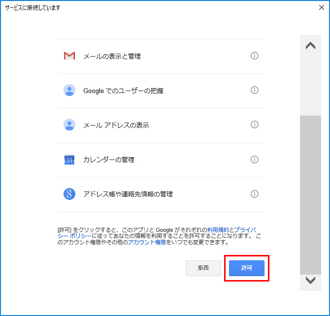 メールの表示と管理などは、Gmailからの情報を取得するために必要なので、「許可」をクリックします。