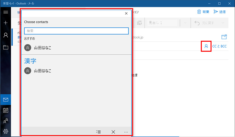 以降は、新規メールを作成する際に、「宛先」の「人物と+」のマークをクリックすると、登録したメールアドレスを呼び出せます。