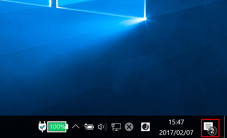 設定の完了後、メールの着信があると、通知領域に件数が表示されるので、クリックします。
