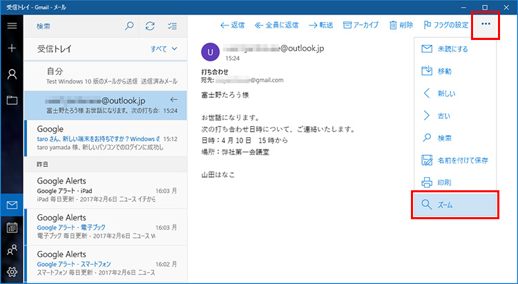 受信メールのメニューボタンをクリックし、「ズーム」をクリックします。