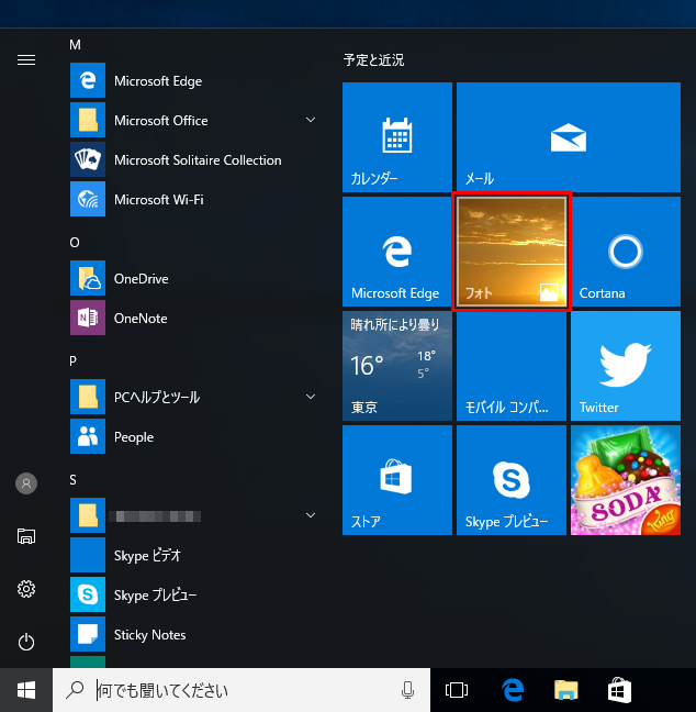 「スタート」ボタンをクリックし、「フォト」タイルをクリックします。