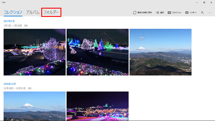 「フォト」アプリが起動し、「コレクション」画面が表示されます。「フォルダー」をクリックします。