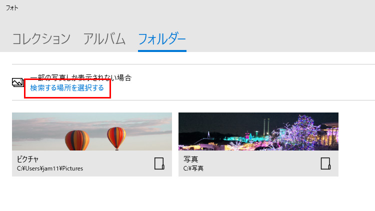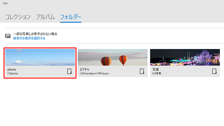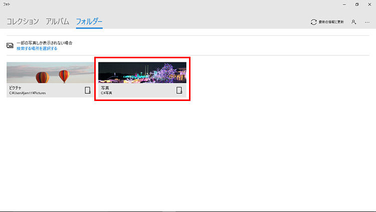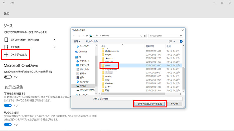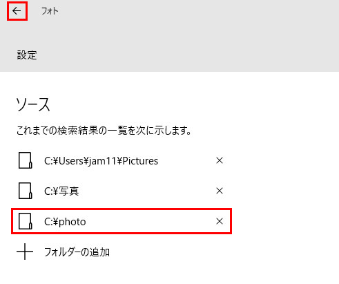 目的のフォルダーが表示されていない場合は追加します。ここでは、「C:¥photo」フォルダーを追加してみます。