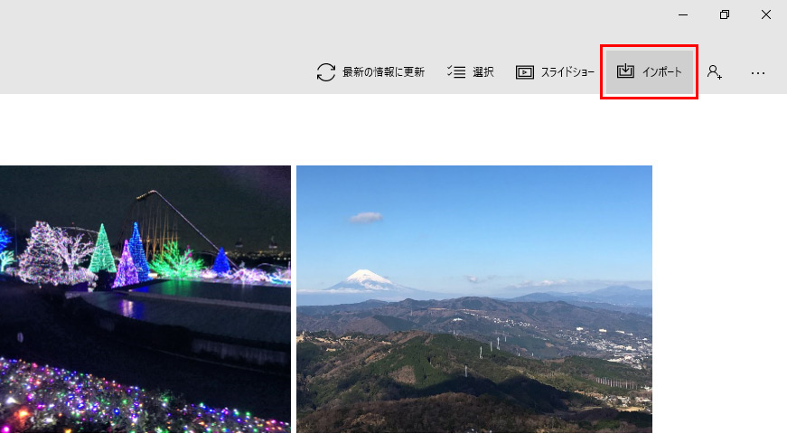 「フォト」アプリのメニューから、デジタルカメラやスマートフォンの画像データを取り込むことができます。