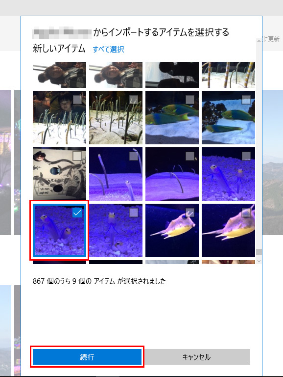 アイテム選択画面で、取り込みたい画像にチェックを入れ、「続行」をクリックします。次の画面で「インポート」をクリックすれば画像が取り込まれます。
