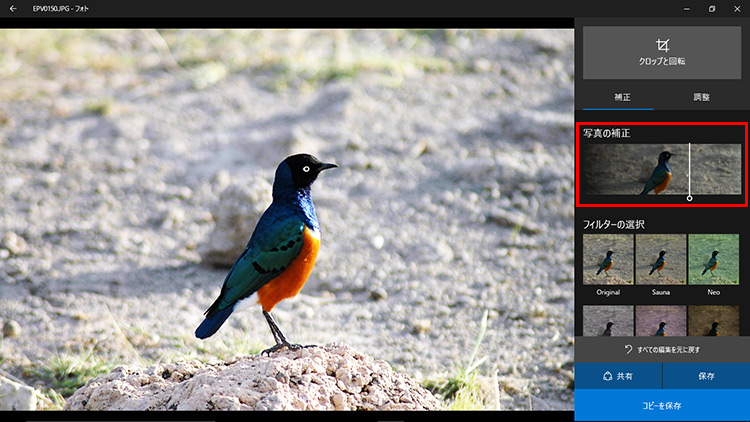「写真の補正」をクリックし、表示されたバーをドラッグすることで、補正の度合いを変更することができます。