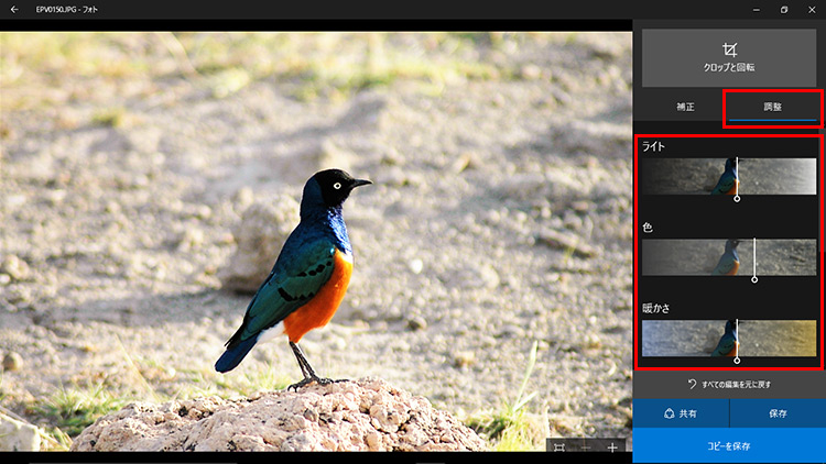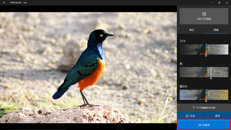 編集したデータを保存する際に、「保存」をクリックしてしまうと、元のデータを上書きしてしまいます。念のため、「コピーを保存」をクリックして、編集前のデータとは別の画像ファイルとして保存しておくと良いでしょう。